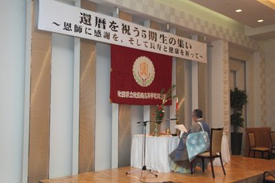 「それ、恭しく惟れば、我等、還暦の齢を迎うるにあたり、各々懐かしき想いを胸に抱き各地より本日ここに参集したまえり。(中略)遠く鳥海山を眺めし学舎にて教えを賜りし恩師の授業のエピソードの数々、(中略)その思い出と交えし友情は、今、尚、いささかも色あせること是無し、(中略)現在幸いに職分を得、現代社会に処を得、安らかに日々を送るは、洵にこれ、遠くは宿縁の然らむるところ、近くは世々生々一切の恩師、学友の化導によると知るべし。」と厳粛に進み、不幸にして還暦を迎えることのできなかった同期生等に黙祷を捧げ式は終わった。