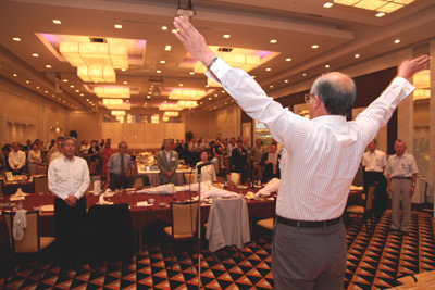 ガッツポーズで記念写真撮影をした後、熊谷隆益実行委員長の挨拶、杉田宏先生挨拶、大山同窓会副会長の乾杯で宴会が始まり、恩師のスピーチ、クラス毎の写真撮影、東京5期会のプレゼント・ゲット・ゲーム等々があって、トリは高橋豊のリードによる校歌斉唱とエール、そして川合同窓会長の中締めで、参加者全員が2次会へと流れ込み、大いに盛り上がる。