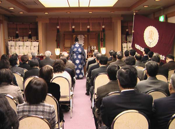 予定時刻から少し遅れの神事。一期生七十名弱の還暦、恩師へは健康長寿の御祓い、神殿脇には母校事務長・六期鶴田宣夫氏の手配してくれた同窓会旗が立ち会いし、厳粛のうち無事修了。直ちに別室での記念写真、これまで何回か一期会を開催してきたが全員の集合写真を本職の写真屋さんへ注文したのは初めてではなかったか。