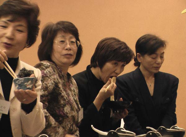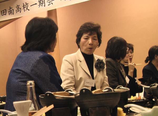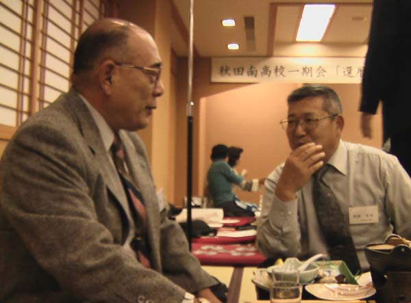その後宴も最高潮に盛り上がり、予定していたクラス毎による参加者スピーチ時間を省略しもなお足りず、お膳を前に仕事や家族のこと、互いの健康の確認、近い将来の年金のこと等々の語り合いもアッという間の四時間であった。北都銀行・菅原晟君の中締め、最後に県庁・仲谷廣君の音頭で声高らかに校歌斉唱し、お開きとなりました。新潟の酒販店・中村優子さんの差し入れの中から、越乃寒梅を御神酒として献上、雪中梅・八海山などの秋田では口にすることが希な銘酒が振る舞われ宴席でも大好評、通の連中には特に濁酒に人気があったようでした。