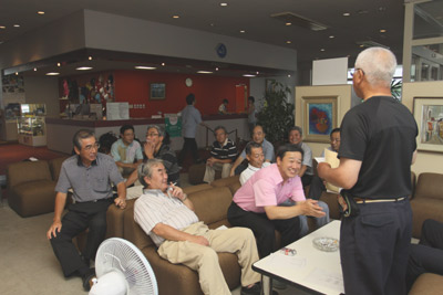学校敷地内を熊谷隆益実行委員長の案内で散策。敷地の広さに驚くも室内練習場で野球部の練習を見学など楽しむ。その後、伊藤副校長の案内で広い校舎をほぼ一巡、校長室で休み、教室で席に着き、音楽室で涼んで…。