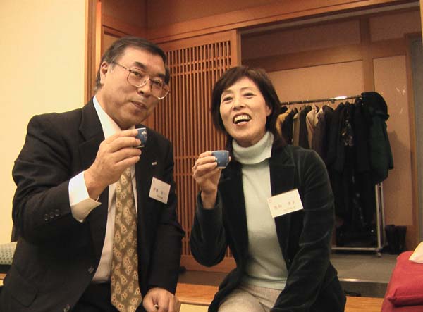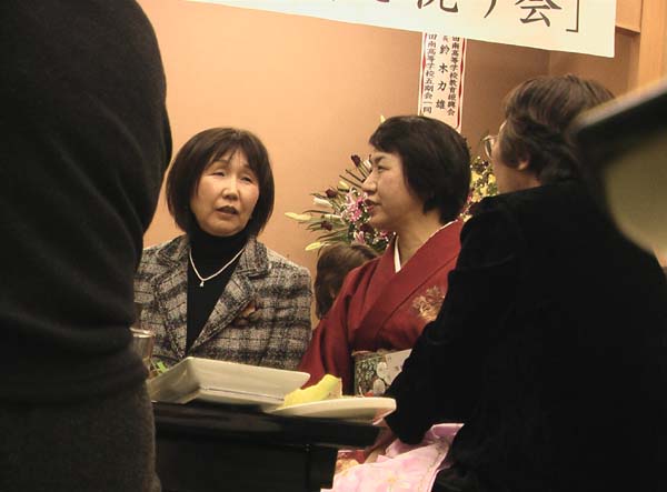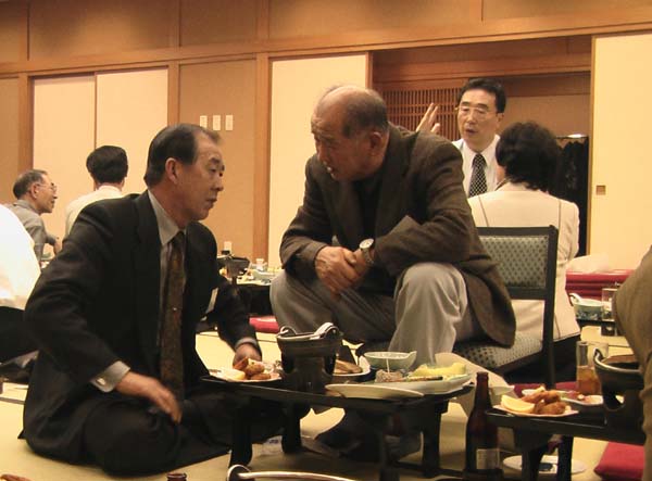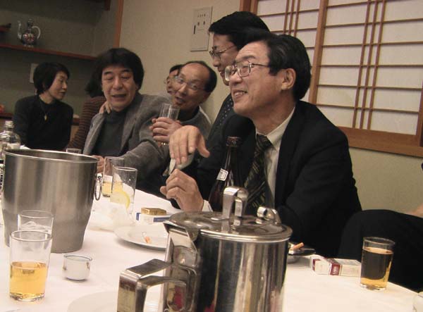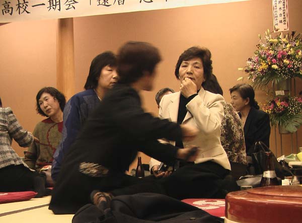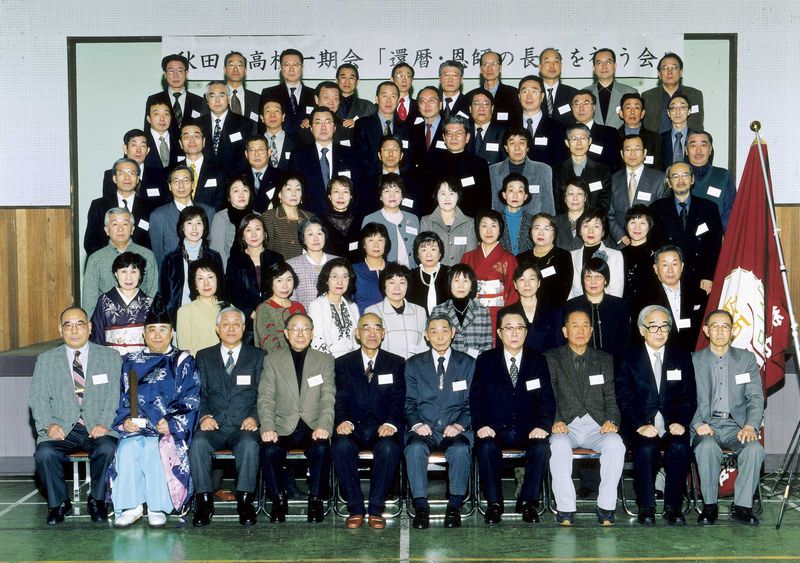 その後宴も最高潮に盛り上がり、予定していたクラス毎による参加者スピーチ時間を省略しもなお足りず、お膳を前に仕事や家族のこと、互いの健康の確認、近い将来の年金のこと等々の語り合いもアッという間の四時間であった。北都銀行・菅原晟君の中締め、最後に県庁・仲谷廣君の音頭で声高らかに校歌斉唱し、お開きとなりました。新潟の酒販店・中村優子さんの差し入れの中から、越乃寒梅を御神酒として献上、雪中梅・八海山などの秋田では口にすることが希な銘酒が振る舞われ宴席でも大好評、通の連中には特に濁酒に人気があったようでした。