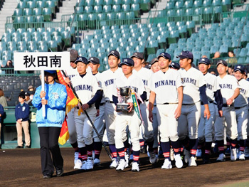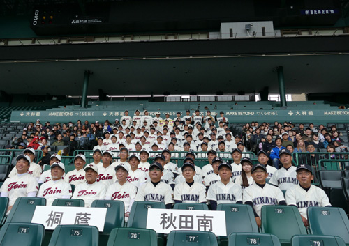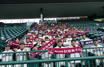この度の阪神甲子園球場で開催された「マスターズ甲子園2025(第22回大会)」の出場に際しましては、皆さまから温かいご声援を賜り、誠にありがとうございました。 我々、秋田南高校野球部OB(選手49名、事務局3名)は11月8、9日に開催された本大会に初めて出場して参りました。初日は秋晴れの下、憧れの甲子園球場で入場行進はできたものの、翌朝からの雨の影響により、二日目の交流試合(和歌山県代表桐蔭高校OB戦)は中止となってしまいました。参加者一同「不完全燃焼」の状態ですが、来年以降、再び予選を勝ち抜き、今度こそ甲子園球場で野球がしたいと思っております。 参加にあたり、時間等の余裕もなく寄付を募ったところ、多くのご支援を賜りました。皆様からの「南校を甲子園に…」との想いを受け、OB一同、心から感謝を申しあげます。 今後とも一層のご指導ご鞭撻を賜りますようお願い申しあげます。