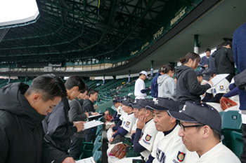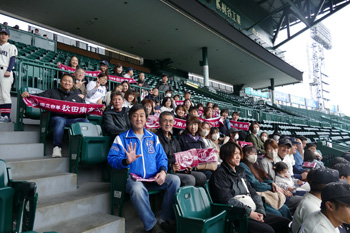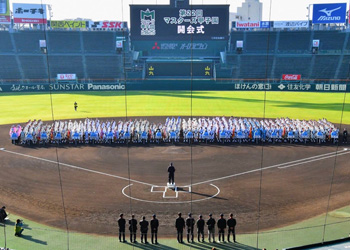 秋田南高校野球部OBチーム(年齢は20代から60代)は、夏の秋田県予選を勝ち抜き、令和7年11月8日、9日に開催された「マスターズ甲子園2025 第22回大会」に参加してきました。11月7日は、大会前夜祭(会場:都ホテル尼崎)が開催され、全国より選抜された20チームが集まりお互いにエールの交換をし、大いに盛り上がりました。 11月8日は、快晴の阪神甲子園球場にて開会式が開催され、秋田南高校OBチームは各自憧れの甲子園に感銘を受けながら入場行進を行い、初めて甲子園球場のグラウンドに立ちました。その後、明日の試合に向け大阪市内の居酒屋にて決起集会を行い、世代の違いを乗り越え盛り上がりました。 11月9日は、朝からの強い雨で2日目の試合はすべて中止と判断され、試合は出来ませんでしたが大会事務局の配慮で甲子園球場の裏側を見学させていただきました。室内練習場でのキャッチボール、グラウンド内のベンチ見学、ベンチ前での校歌斉唱、雨中のグラウンド内撮影等が出来ました。 今回のマスターズ甲子園2025大会に参加して、肝心の甲子園球場で親善試合は叶いませんでしたが、各自よい思い出にはなったのではないでしょうか。甲子園で試合に勝つ!という宿題は置いてきましたが、リベンジに向け2026年大会も出場を果たし、甲子園に置いてきた忘れ物を取りにいきたいと思います。 これからも同窓生の皆様のご支援をよろしくお願い申し上げます。